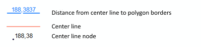 In terms of this tool, the polygon width is the sum of shortest distances from the center line nodes to the polygon borders.